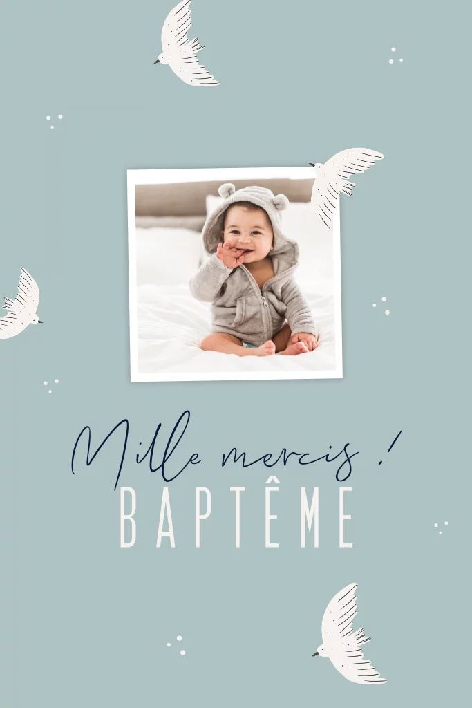 Carte de remerciement pour le baptême, fond bleu avec oiseaux blancs