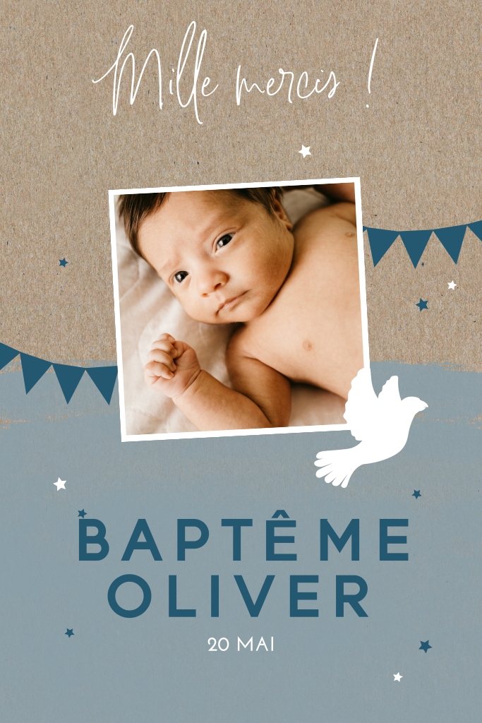Carte de remerciement pour le baptême avec guirlandes bleues et colombes