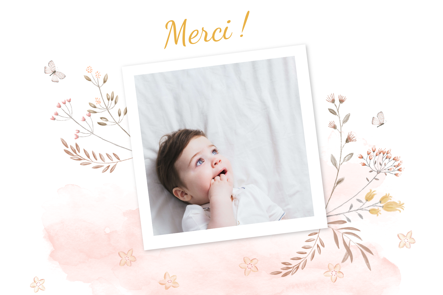 Carte de remerciement baptême avec photo, aquarelle rose et fleurs