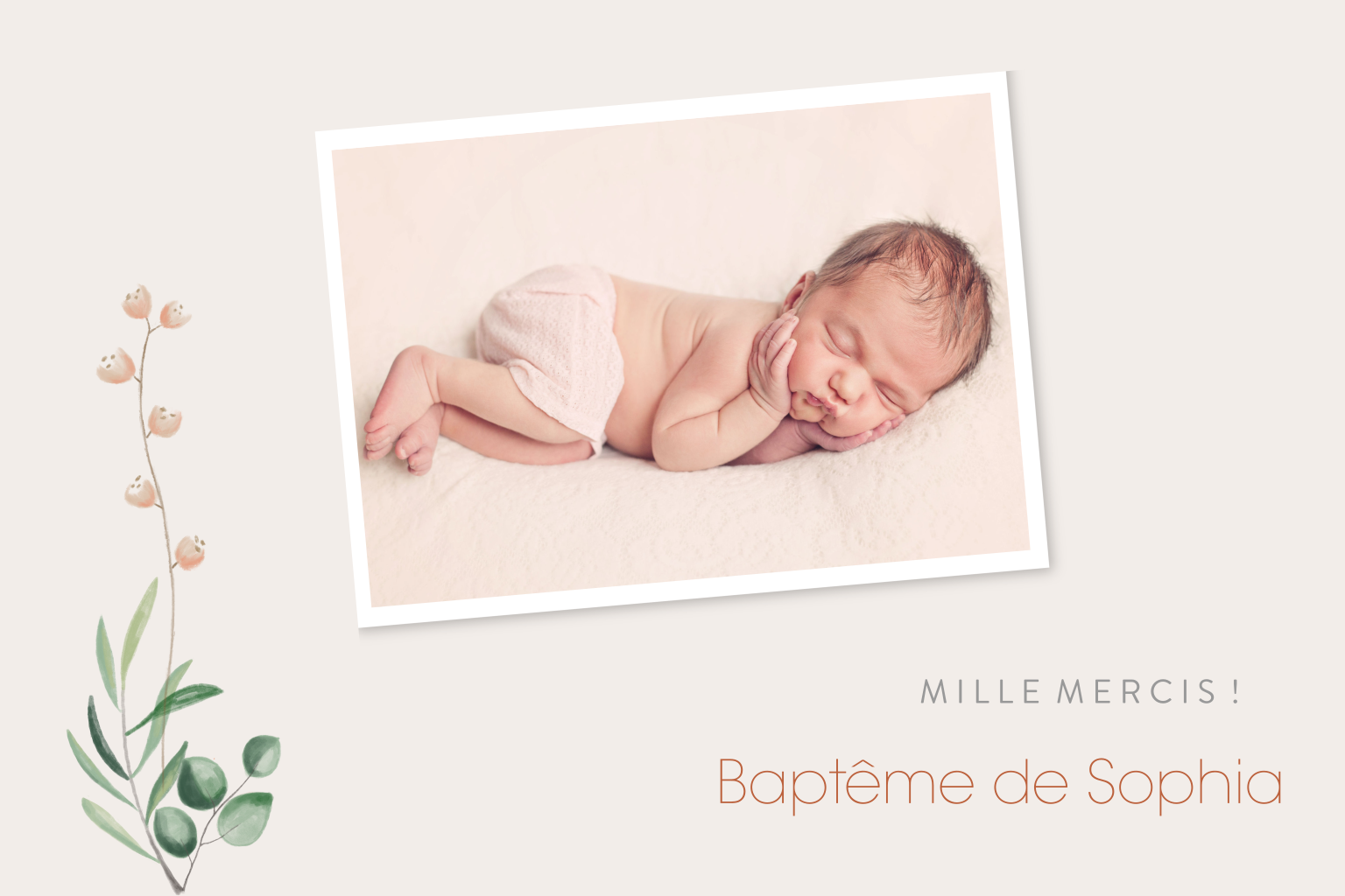 Carte de remerciement de baptême avec photo, feuilles et fleurs