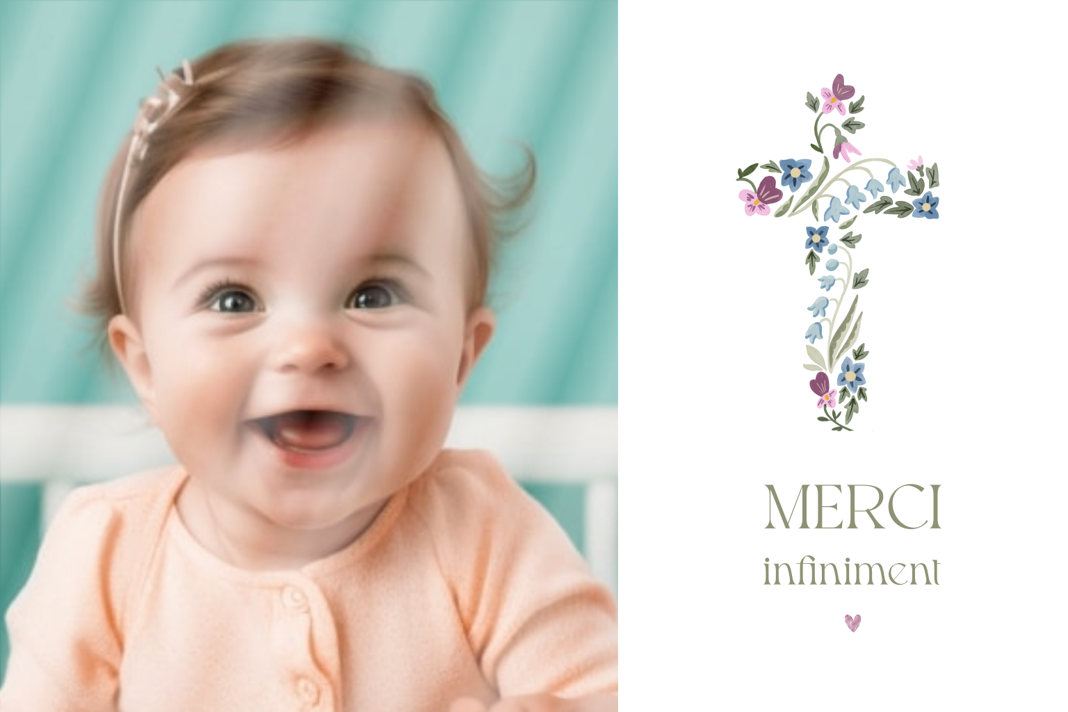 Carte de remerciement de baptême avec photo et croix fleuri.
