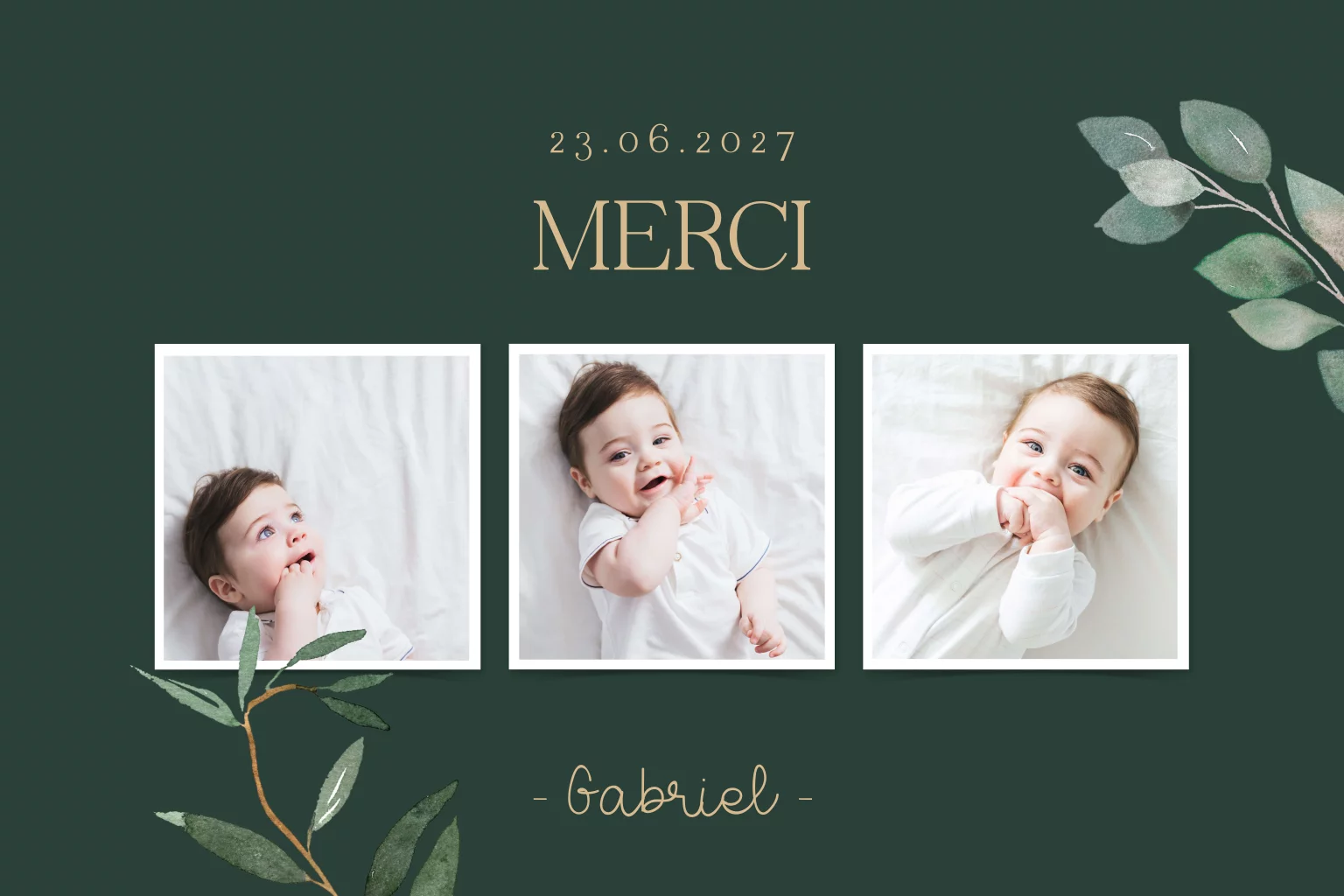 Carte de remerciement de baptême avec eucalyptus et photos sur fond vert