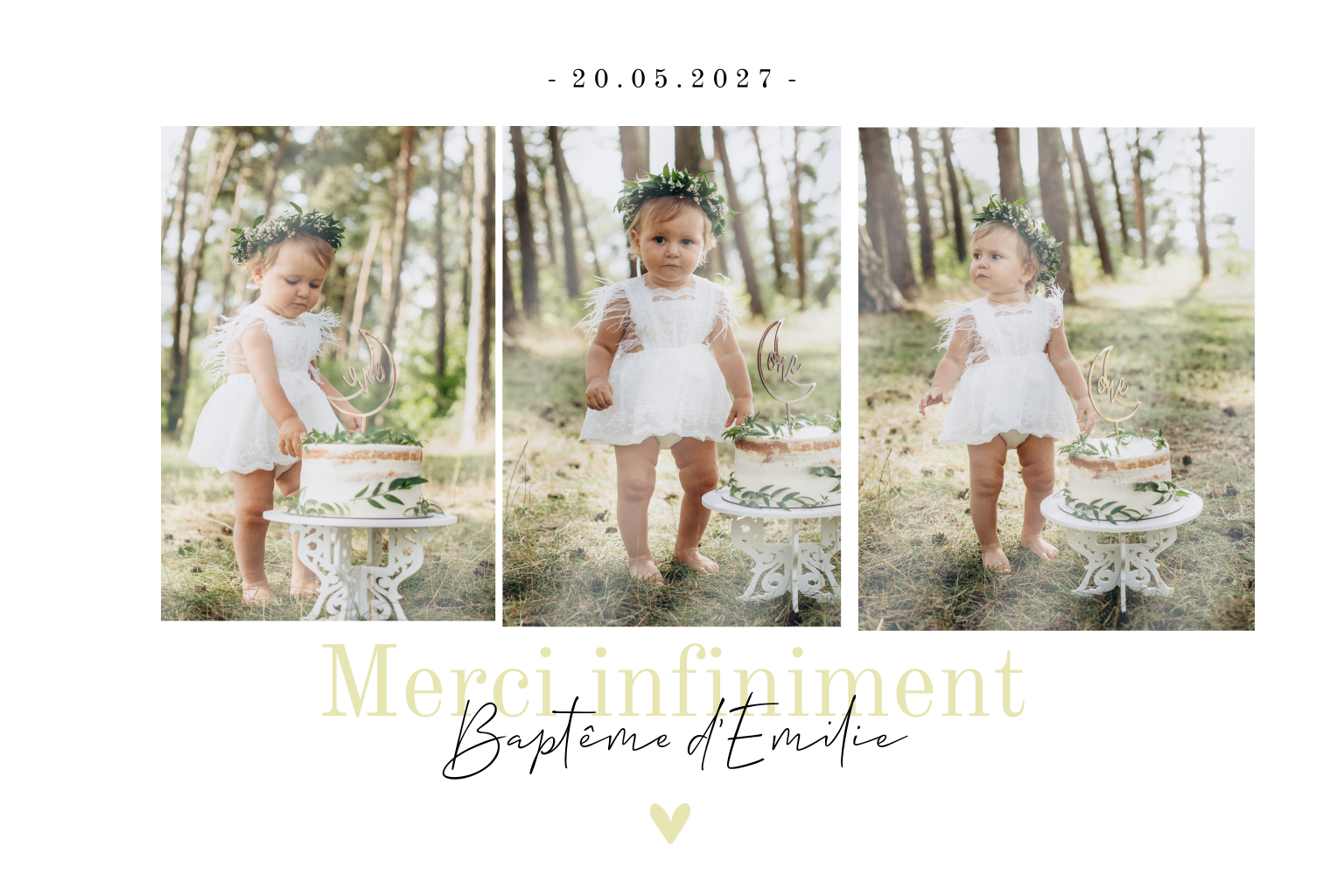 Carte de remerciement de baptême avec trois photos en arche et cœur.