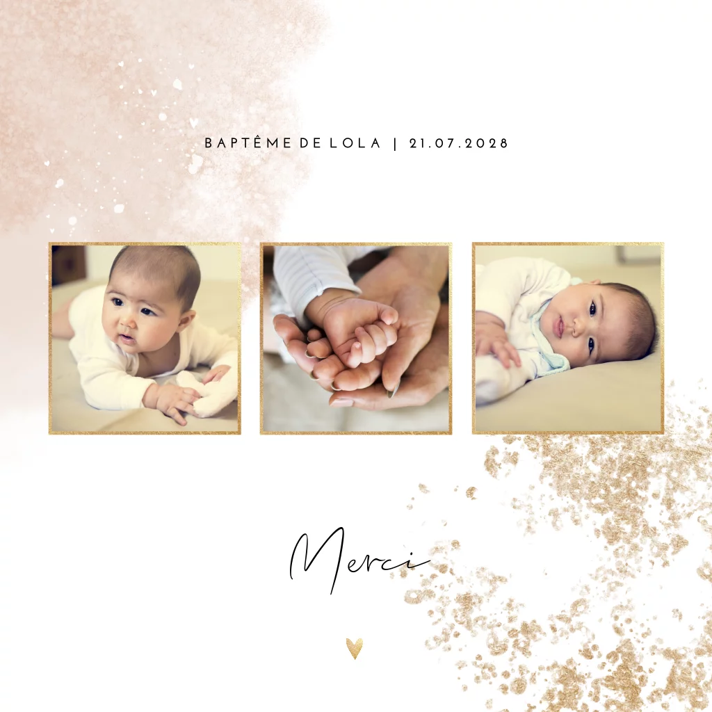 Carte de remerciements pour le baptême avec aquarelle en rose et photos.