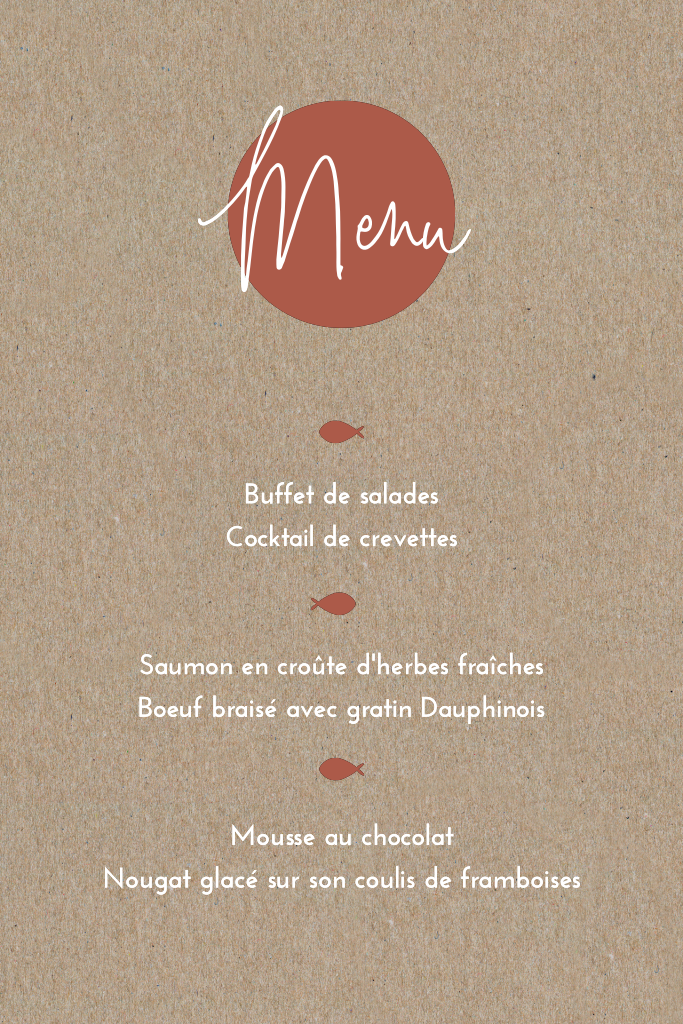 Carte de menu pour le baptême sur du papier kraft avec des poissons
