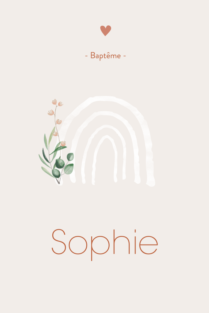Faire-part de baptême avec arc-en-ciel, feuillage et cœur