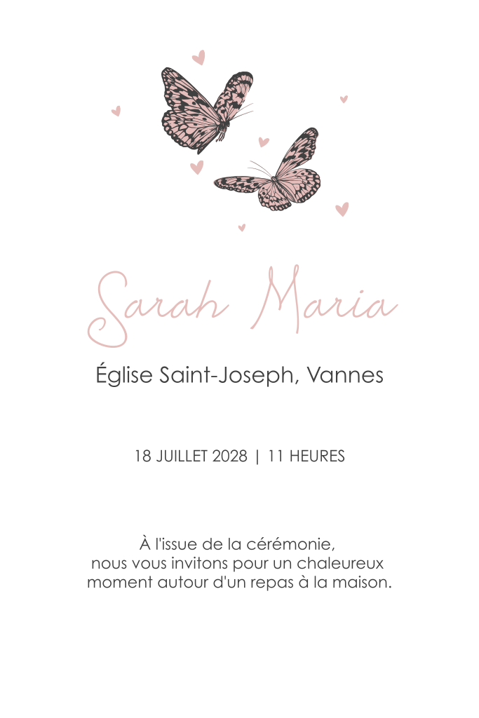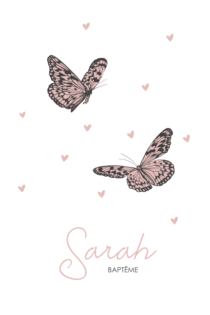 Faire-part de baptême avec coeurs et papillons roses et noirs