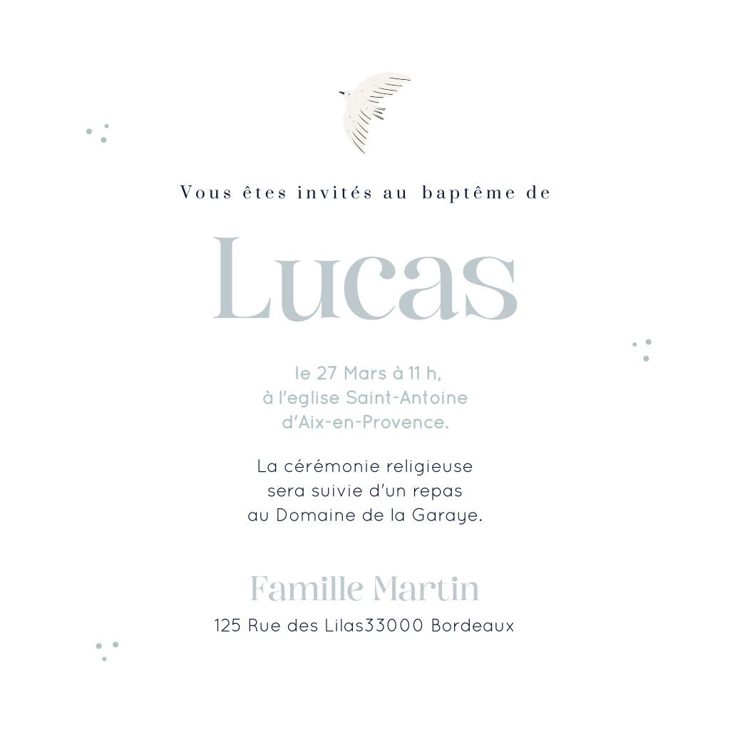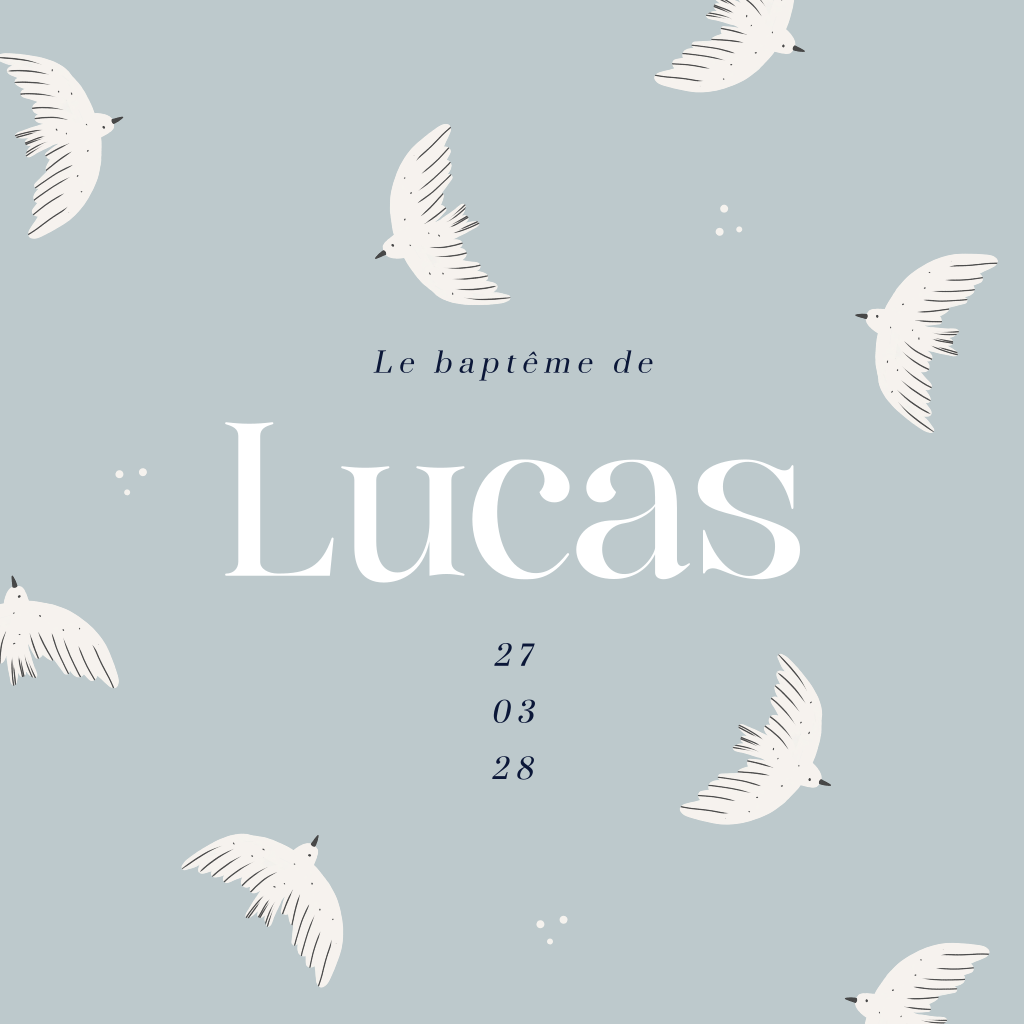 Faire-part de baptême avec des colombes blanches sur fond bleu gris