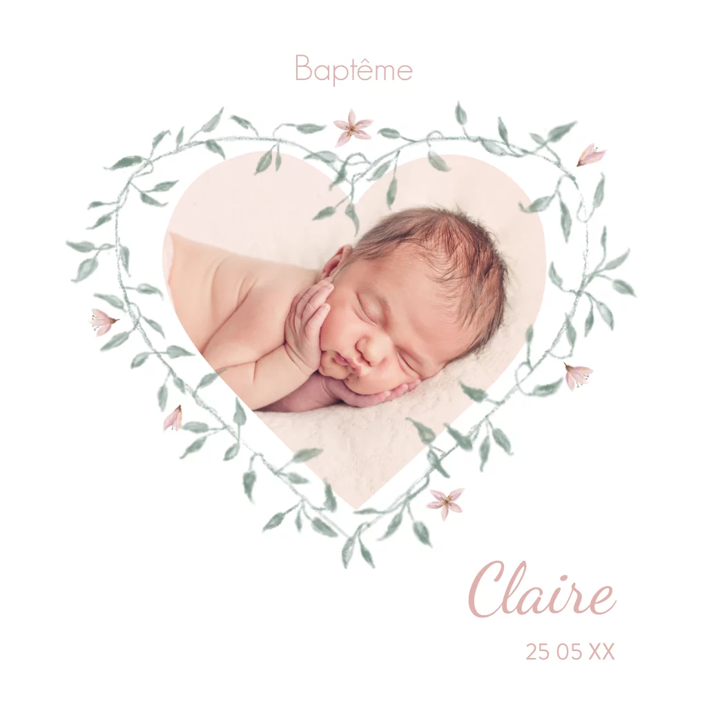 Faire-part de baptême doux avec photo dans un cœur de fleurs