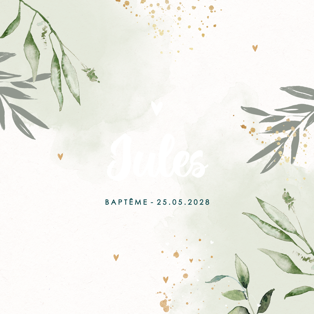 Faire-part de baptême avec feuilles, coeurs et aquarelle verte