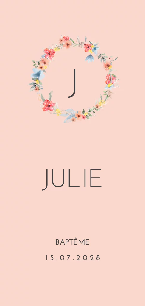 Faire-part de baptême fond rose avec couronne de fleurs