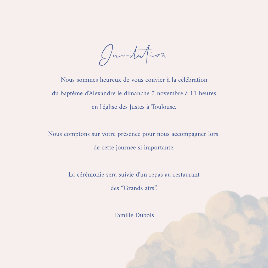 Faire-part de baptême avec nuages et prénom en dorure