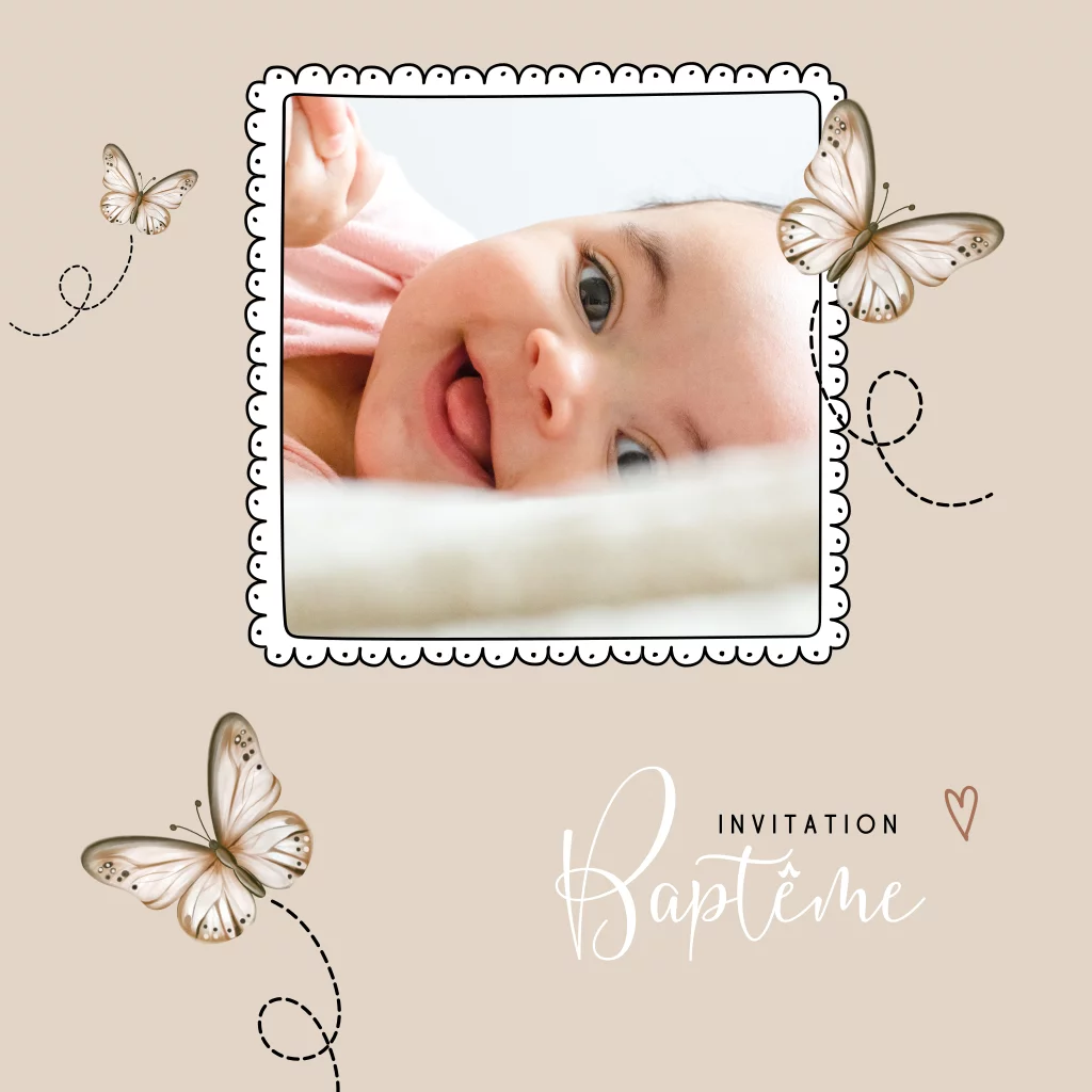 Faire-part de baptême avec photo et papillons sur fond beige.