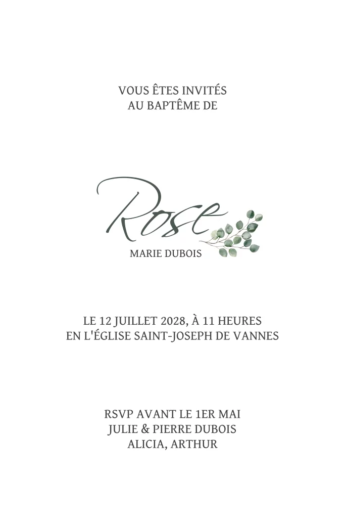 Faire-part de baptême simple et nature avec feuilles d'eucalyptus