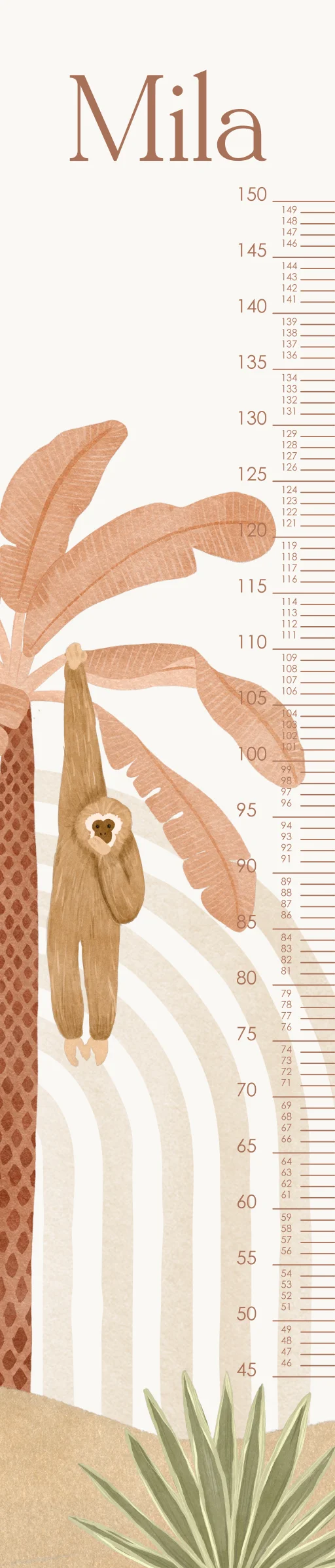Toise avec singe accroché à un palmier