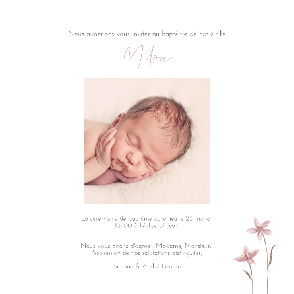 Faire-part de baptême avec photo dans une couronne de fleurs