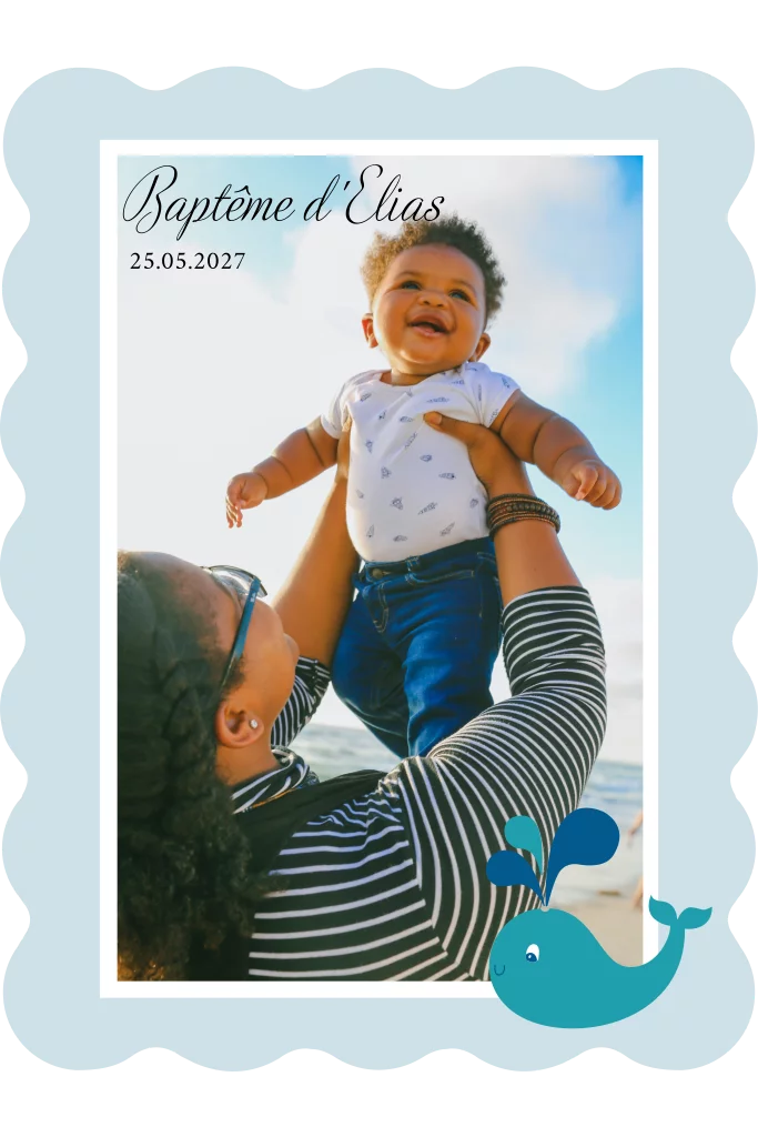 L'invitation au baptême au format portrait avec une bordure ondulée est une invitation belle et élégante pour votre cérémonie de baptême. Nous avons choisi une bordure ondulée pour le design, ce qui lui donne une touche unique. L'invitation est en format portrait et présente à l'avant une grande photo de votre enfant avec un cadre entourant l'image. En bas à droite, il y a une adorable petite baleine qui ajoute une touche de plaisir et de jeu au design. Au dos de l'invitation, le texte d'invitation est placé pour toutes les informations importantes sur le baptême. En raison de la découpe des cartes, il peut y avoir une différence de largeur de 1 à 3 mm (gauche/droite et haut/bas) sur le cadre. Astuce : concevez la bordure aussi grande que possible pour que cette différence éventuelle ne soit pas visible.