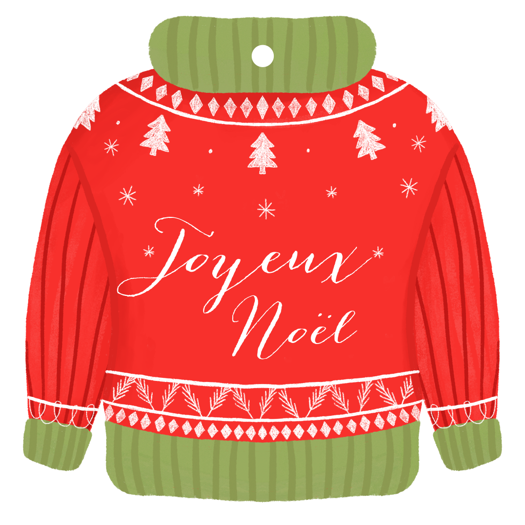 Carte de voeux forme pull de Noël avec sapins et flocons de neige