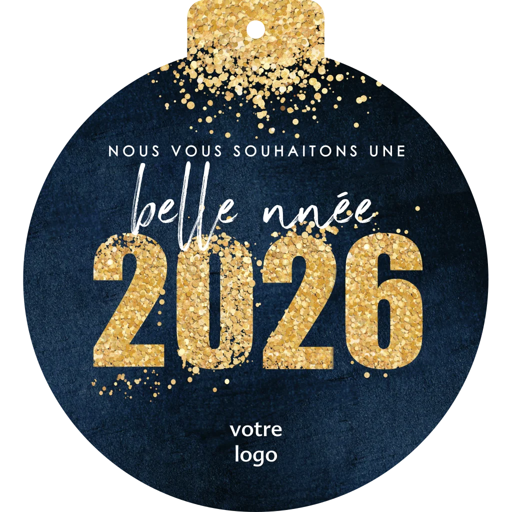 Carte de Noël en forme de boule de Noël avec des paillettes dorées.