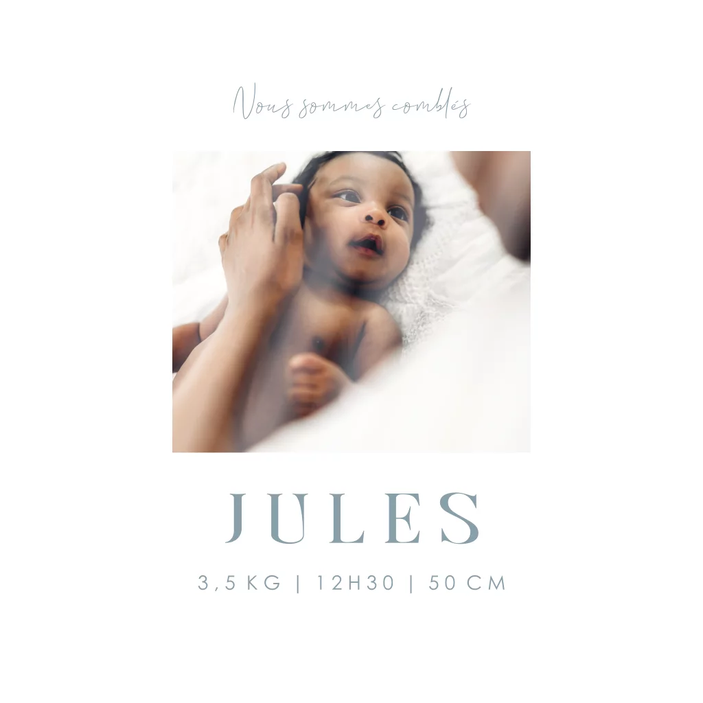 Faire-part de naissance avec fenêtre pour photo et fond bleu.