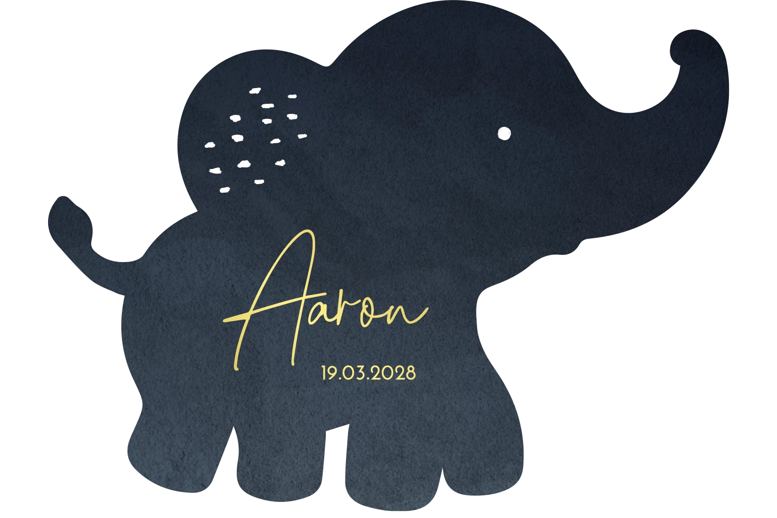 Faire-part de naissance en forme d'éléphant bleu et dorure.