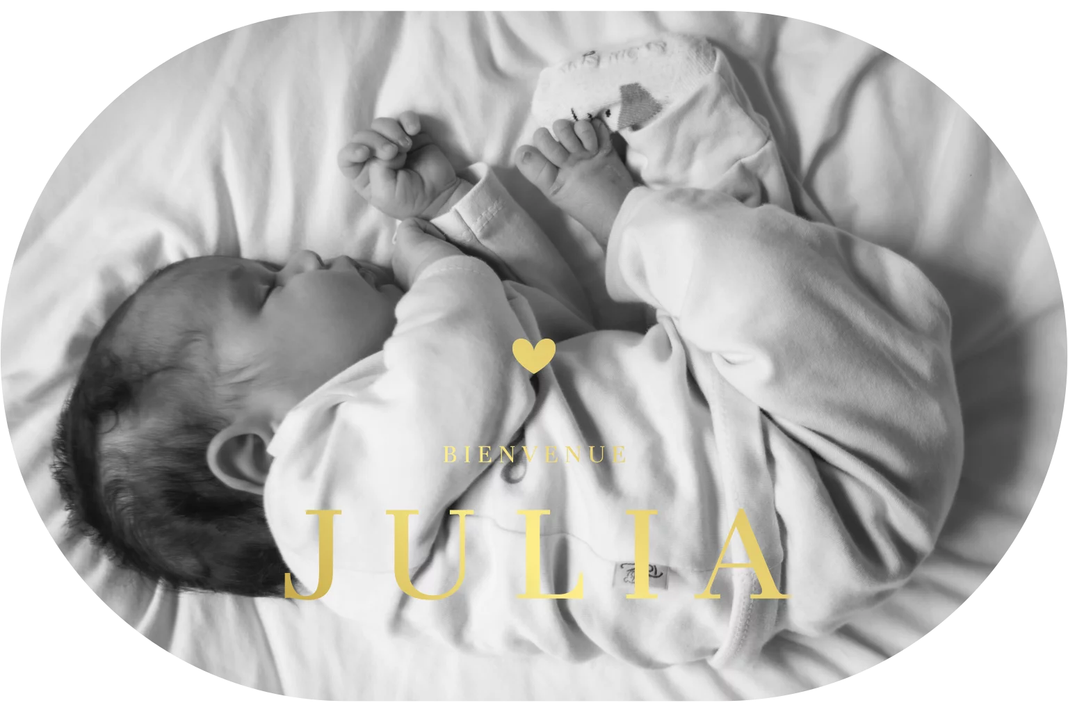Faire-part de naissance avec grande photo en ovale et dorure.