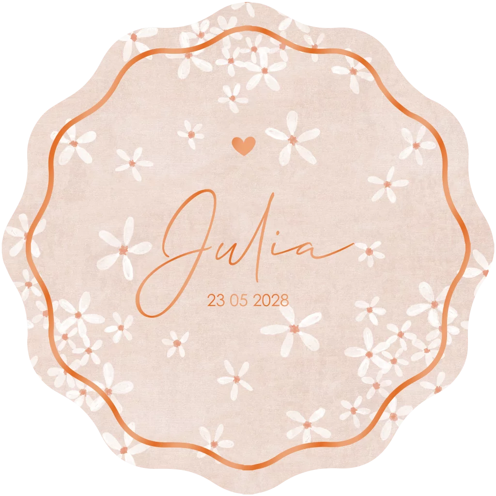 Un joli faire-part de naissance avec une bordure ondulée et des petites fleurs peintes. Le texte et le cadre au recto de la carte sont imprimés ici en vernis brillant, ce qui lui confère un aspect chic. Vous pouvez facilement personnaliser les couleurs et les textes vous-même dans l'éditeur en ligne,