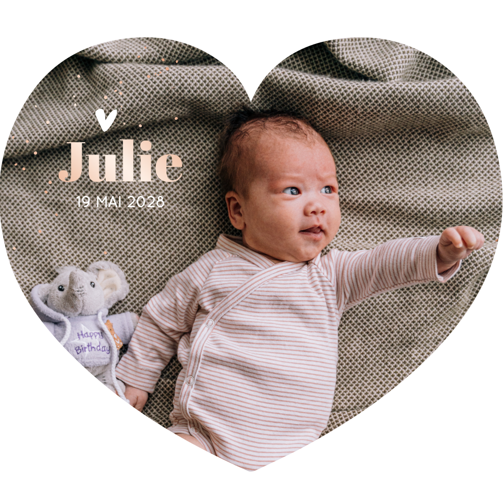 Faire-part de naissance original en forme de cœur et prénom en dorure rosée.