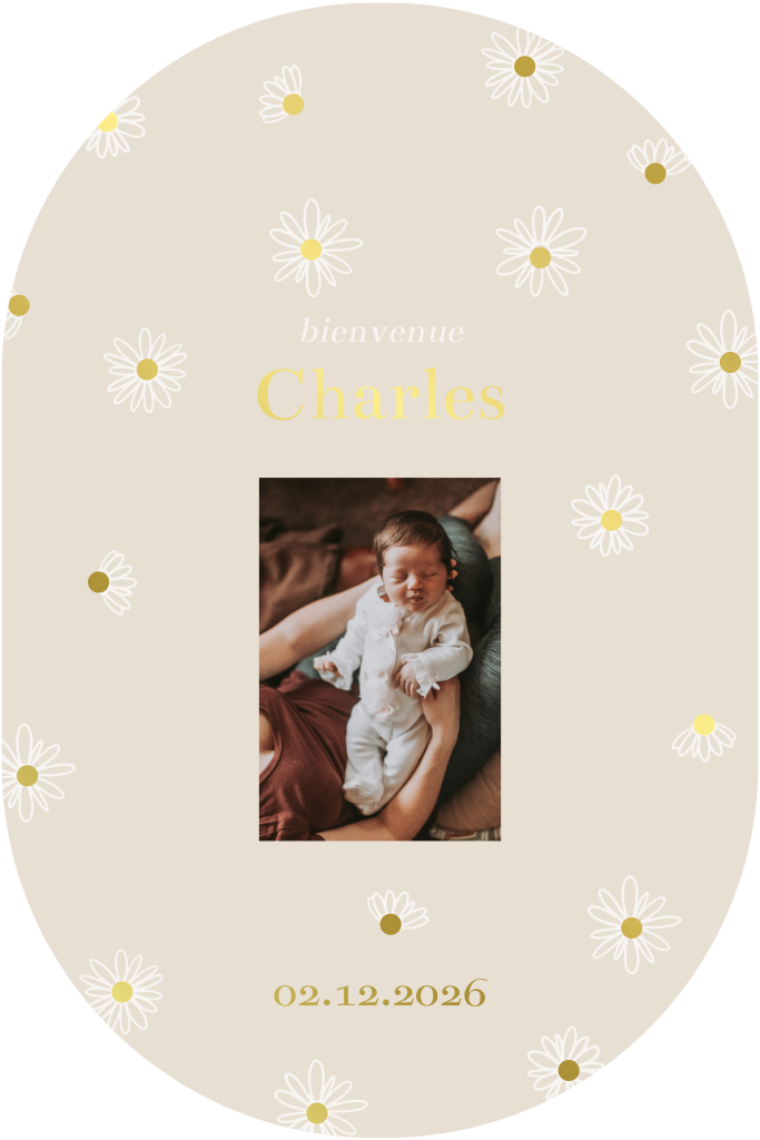 Faire-part de naissance oval avec des fleurs, et des dorures.