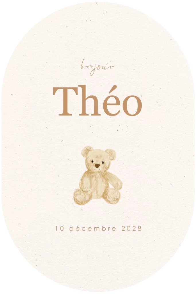 Faire-part de naissance ovale beige avec petit ours en peluche.