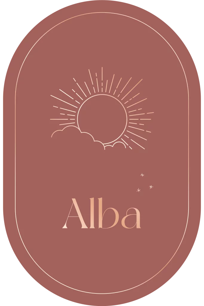 Faire-part de naissance ovale avec soleil et dorure rosée.