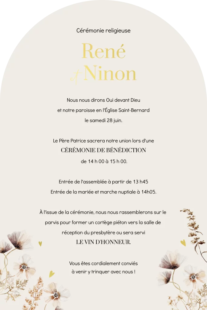 Ajoutez plus d'informations à votre faire-part de mariage, par exemple sur les cérémonie civile et religieuse, grâce à cette carte supplémentaire assortie en forme d'arche.
