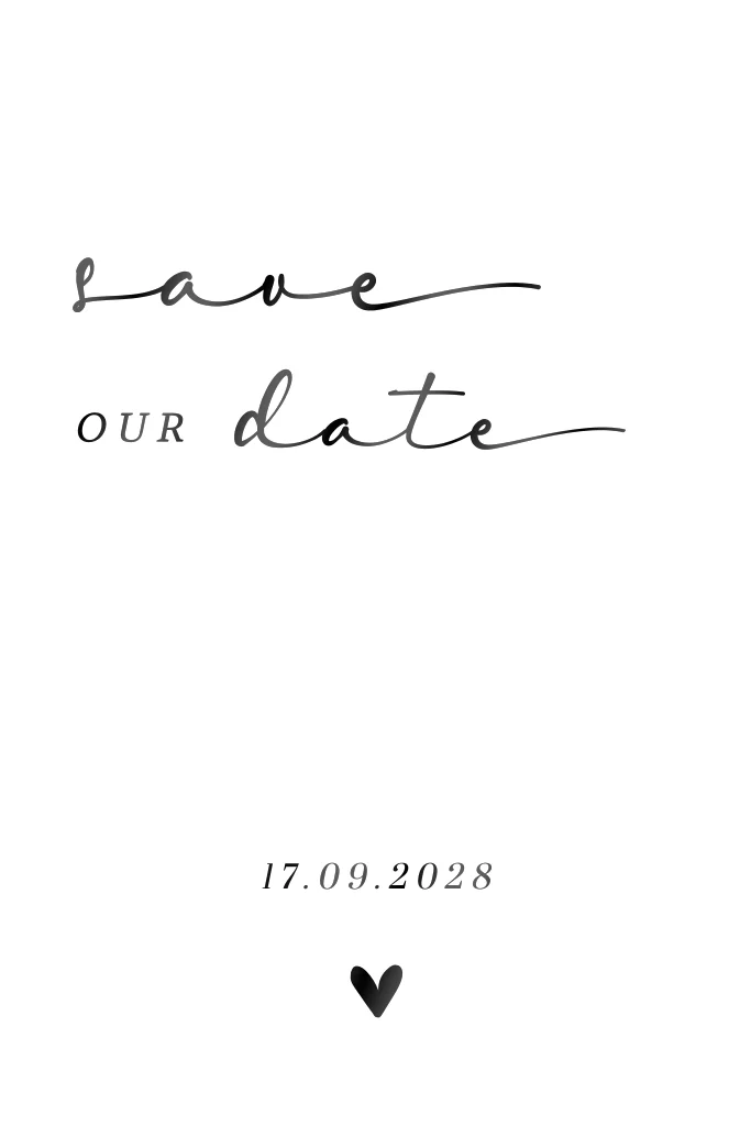 Save the date en arc de cercle avec des petits cœurs et une finition noire brillante.