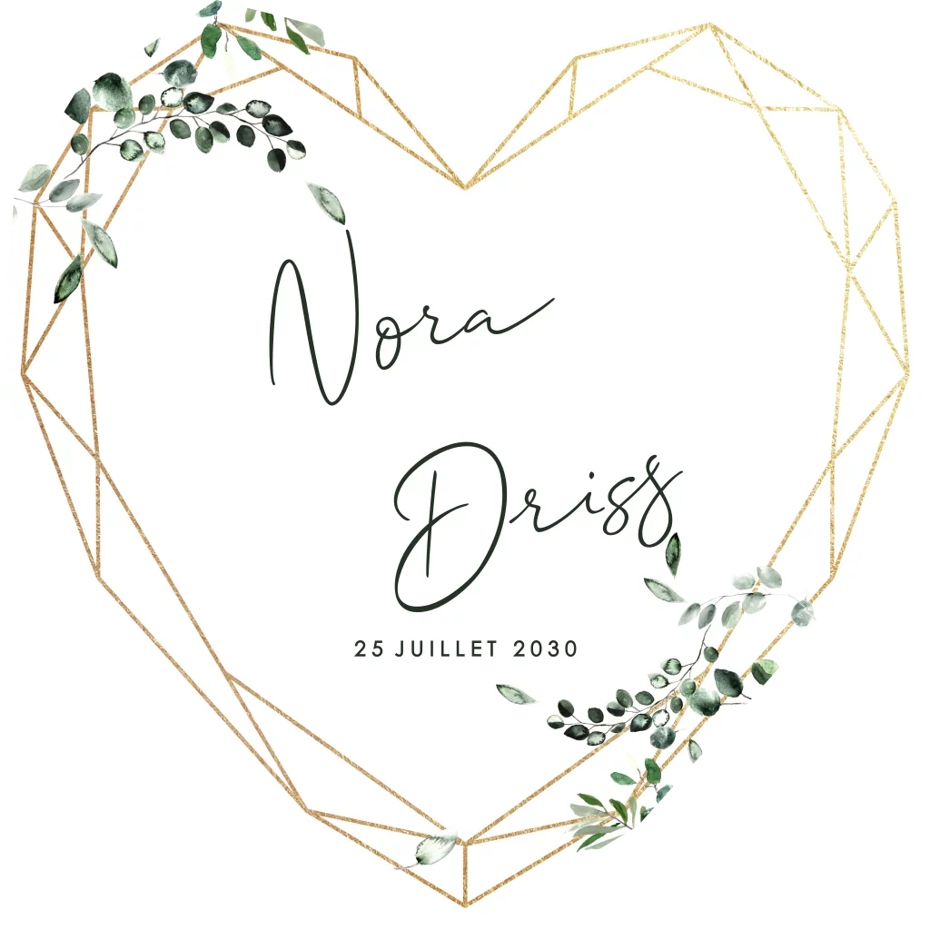 Faire-part de mariage en forme de cœur avec feuille d’eucalyptus et lignes géométriques