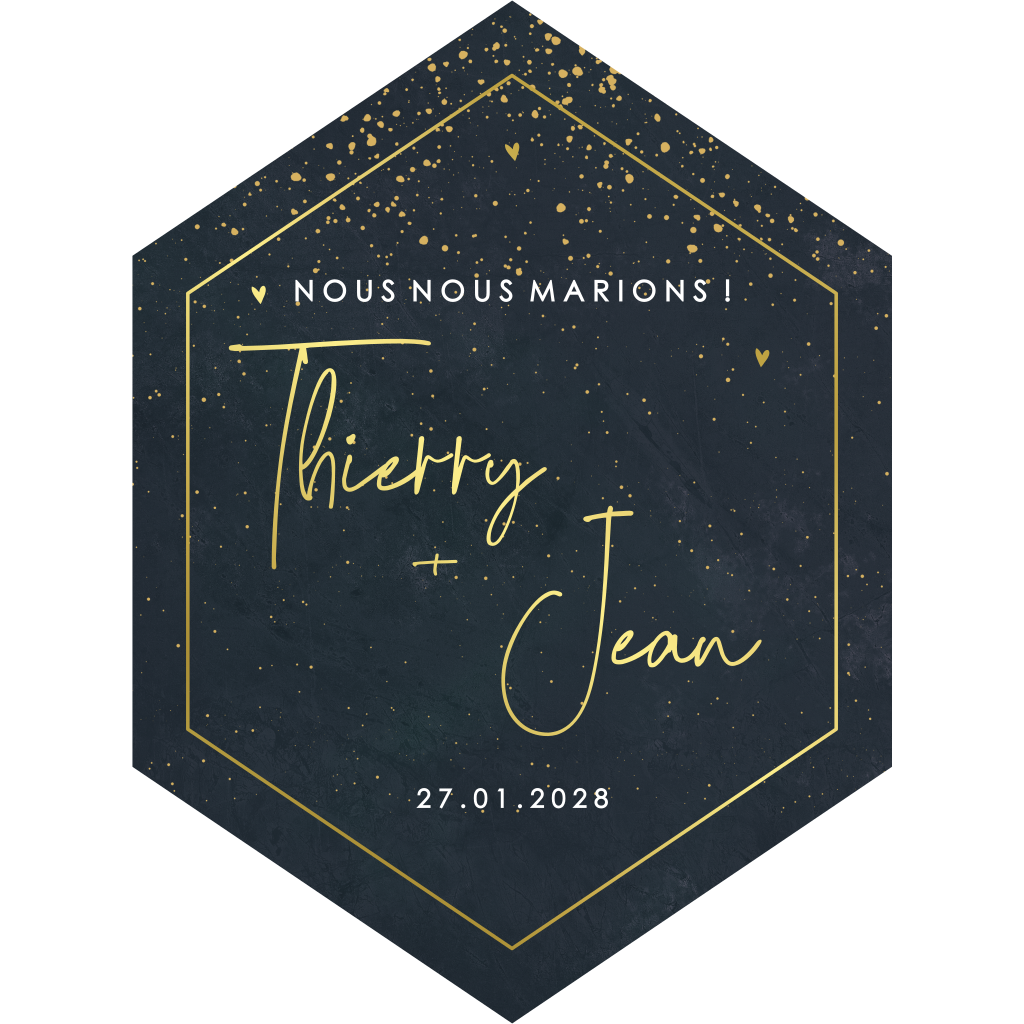 Faire-part hexagonal avec cœurs dorés sur fond bleu foncé