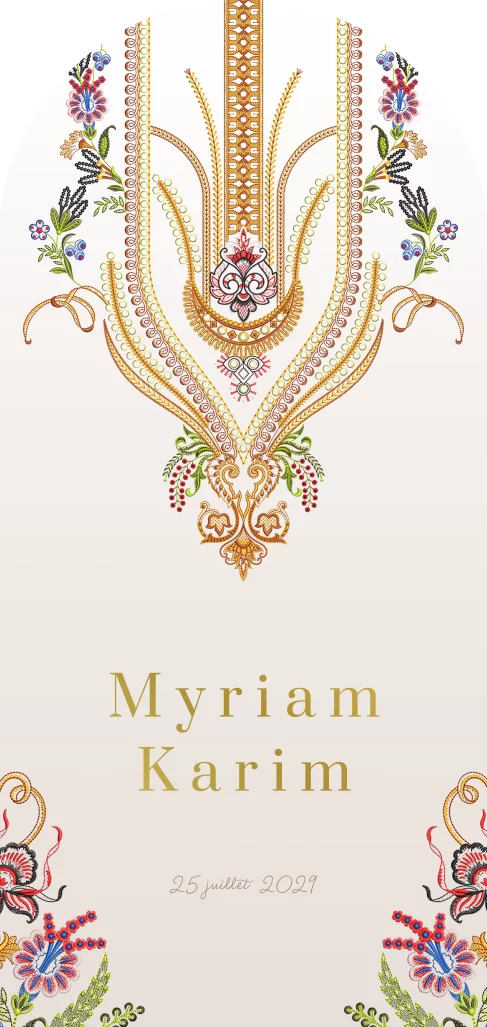 Faire-part de mariage en forme d'arc avec motif moyen-oriental.