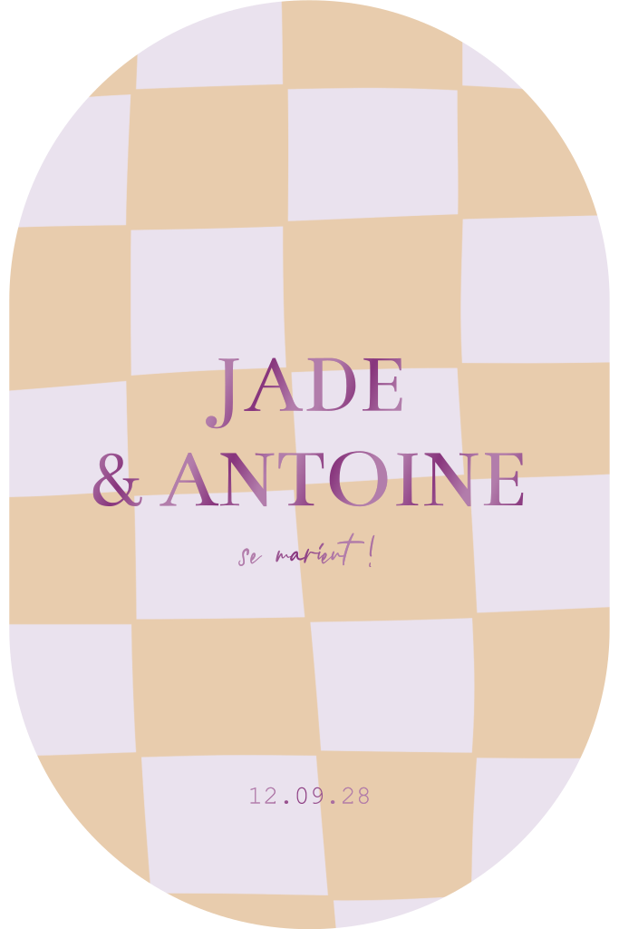Faire-part de mariage tendance avec carreaux violets et orangés.