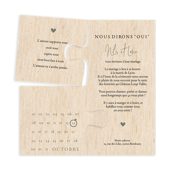 Faire-part original sous forme de puzzle avec aspect bois