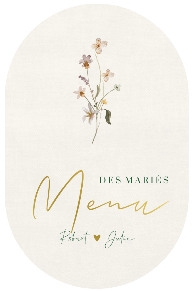 Carte de menu ovale avec des fleurs de champs aquarelles et dorures