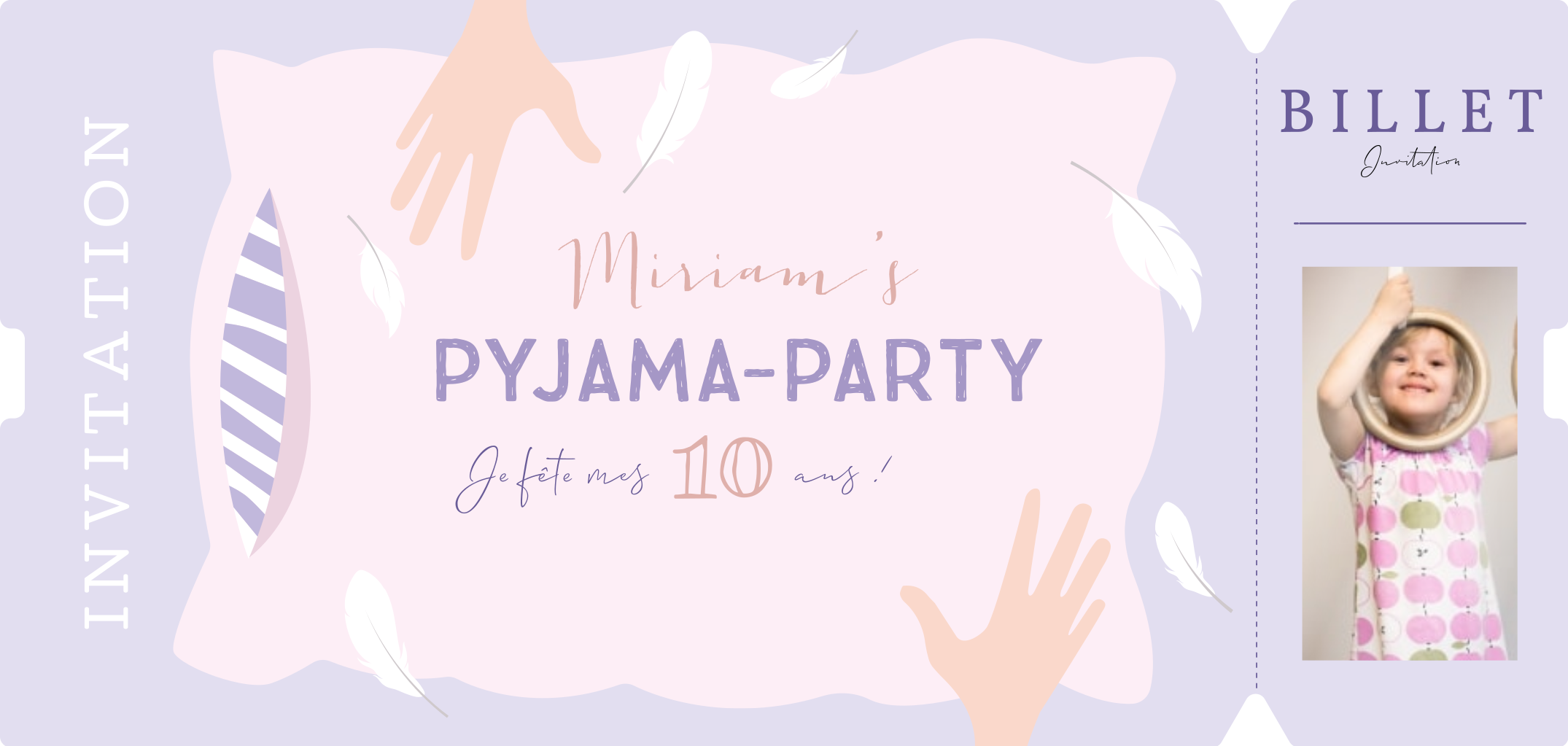 Billet pour une bataille d'oreillers lors d'une fête d'anniversaire pour enfants. Le recto de la carte d'invitation pour la soirée pyjama est coloré et ludique. Au centre de la carte se trouve une grande image d'un oreiller entouré de plumes. Au verso, se trouvent des informations importantes sur la fête. Le texte d'invitation invite chaleureusement tous les amis à la soirée pyjama et donne la date, l'heure et l'adresse de l'événement.