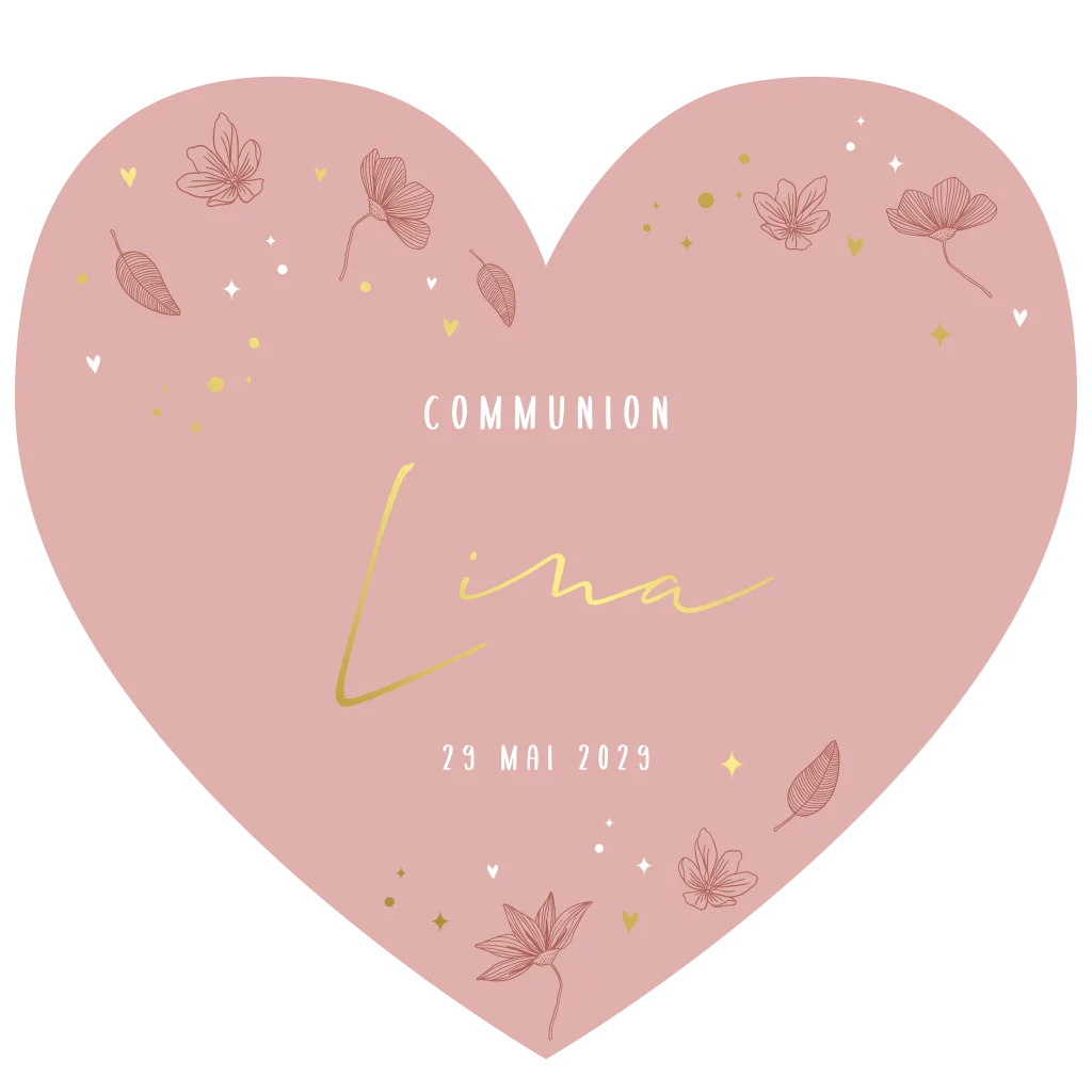 Faire-part communion forme coeur avec illustrations fleurs