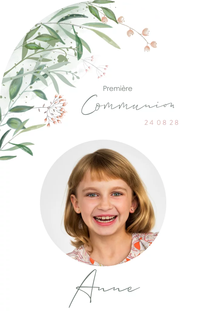 Faire-part de communion arqué avec photo et branches vertes.