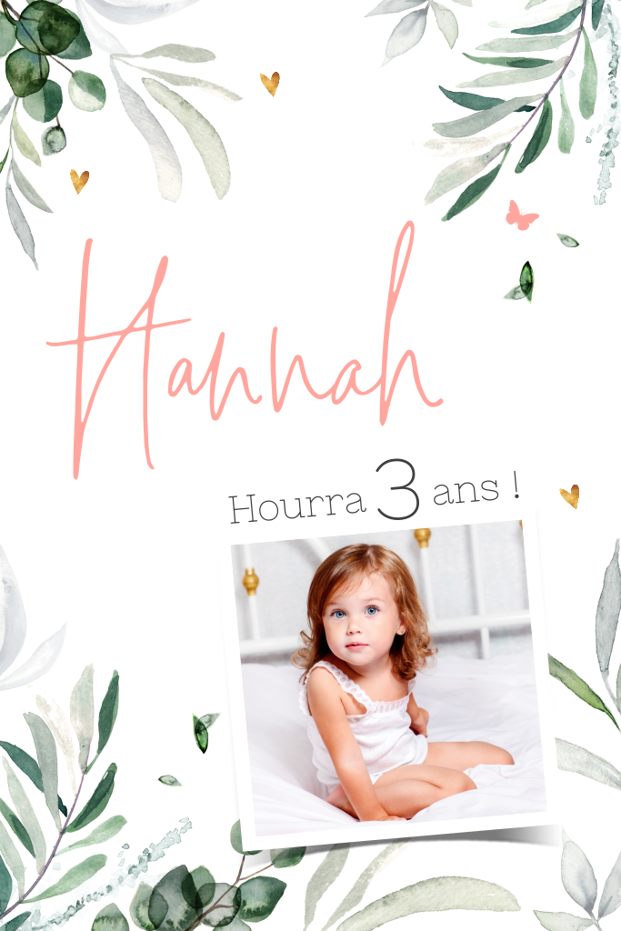 Carte d'invitation tendance avec des feuillages et une photo.