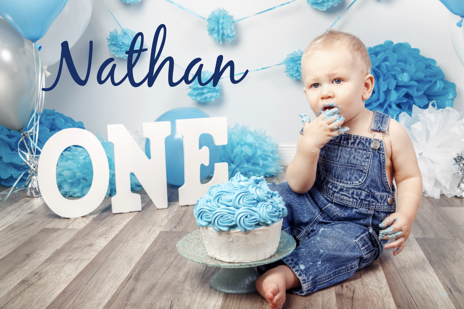 Carte d'invitation pour le 1er anniversaire avec des confettis bleus.