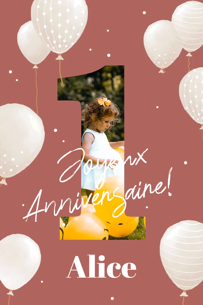 Carte anniversaire enfant avec photo, chiffre1 et ballons