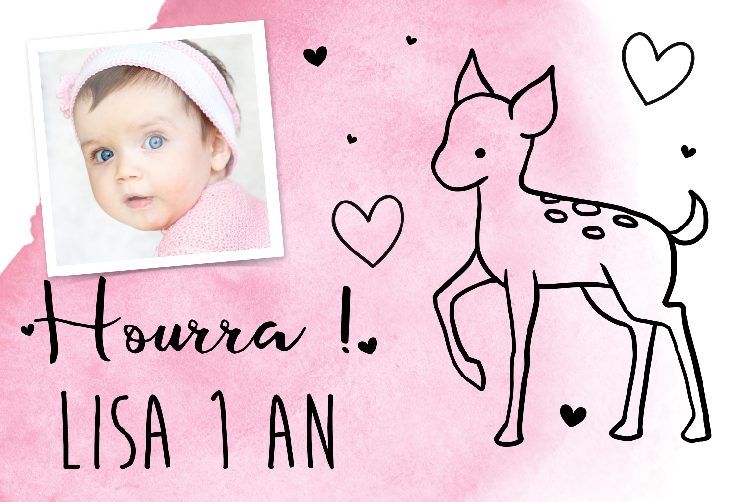 Une invitation mignonne pour l'anniversaire d'une petite fille qui fête ses 1 ans. La carte se compose d'aquarelle rose, d'un dessin d'une adorable biche et de nombreux cœurs. Placez une belle photo de votre fille sur le recto.