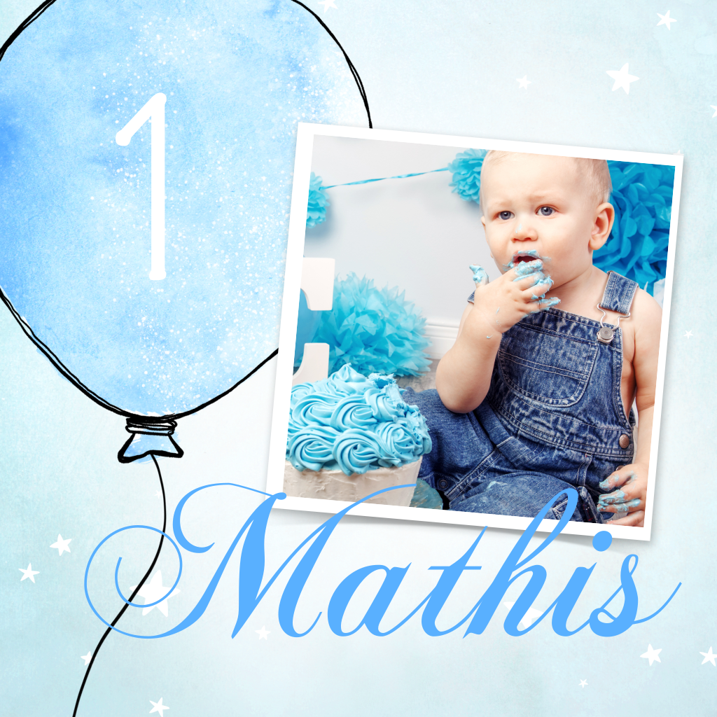 Carte d'invitation douce avec un ballon et photo sur fond bleu.
