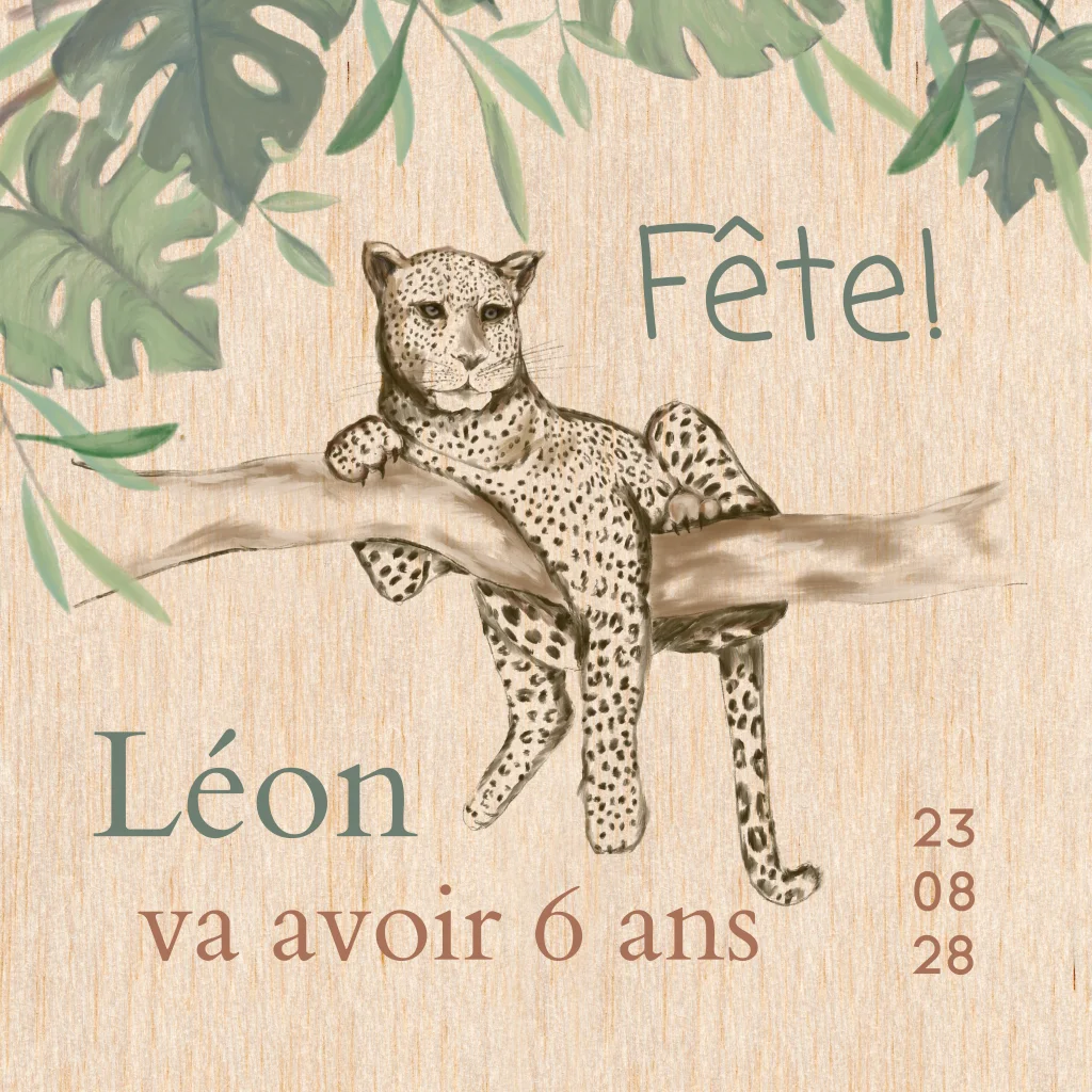 Carte d'anniversaire en bois avec des feuillages et une panthère.