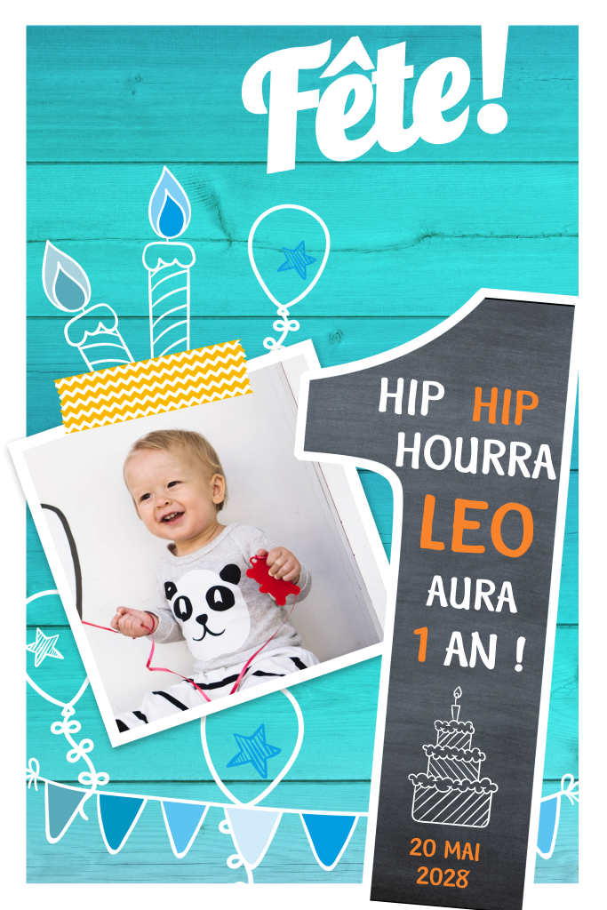Carte d'invitation bleue festive avec guirlandes et ballons.