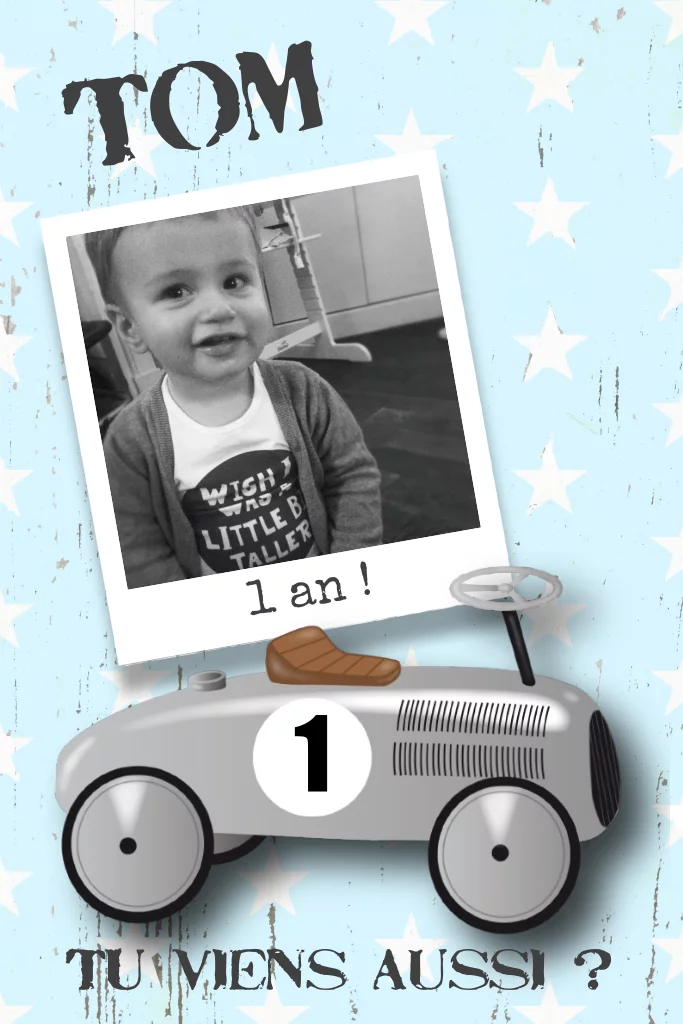 Carte d'invitation avec porteur voiture vintage sur fond bleu.